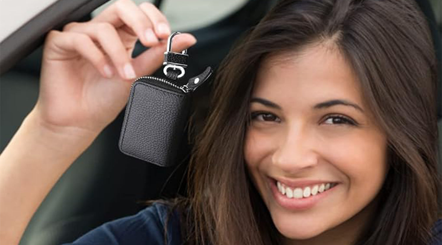 Durable leather case with zipper closure for car keys, house keys, or coins.